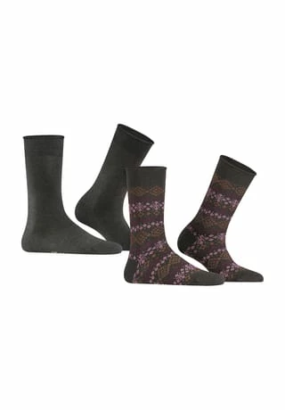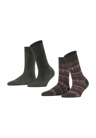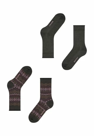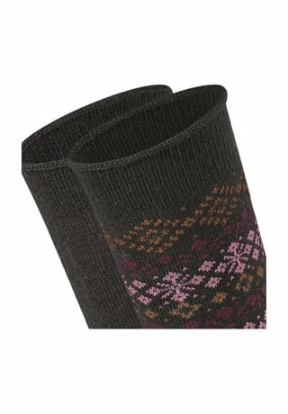 Schön gestricktes Norwegermuster findet sich nicht nur auf Pullovern, sondern auch auf den wadenhohen Socken. Damit werden die kuscheligen Damenstrümpfe mit Schurwolle inklusive femininem Rollbündchen zur perfekten Ergänzung für winterliche Looks mit kernigen Boots oder flauschigen Hüttenschuhen. Die Socken sind im praktischen Doppelpack mit Uni-Socken erhältlich.