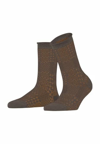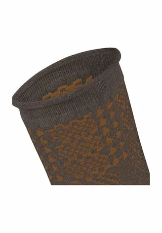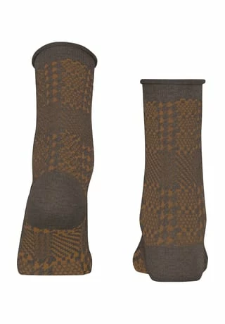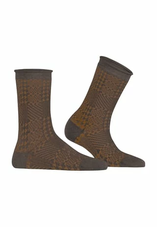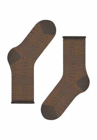 Bei der gröberen Wollsocke gibt das Allover Hahnentritt-Muster den Ton an. Dank des Wollanteils bleiben die Füße bei winterlichen Temperaturen schön warm. Das Rollbündchen unterstreicht den femininen Charakter des Strumpfes.
